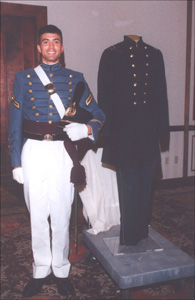 The uniform, displayed on a stand believed to be the same height as General Jackson, was flanked by an honor guard of VMI cadets who stood at attention throughout the evening. Colonel Gibson shared some of the uniform's history, including an anecdote about how its blue color had on at least one occasion allowed Jackson to evade almost certain capture by Federal troops. He also pointed out a spot over the left hip that had been neatly mended by Jackson' servant Jim after the General had been grazed by a bullet.