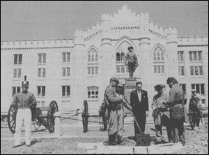 Under a clear blue summer sky, in a ceremony replete with mounted cavalry and infantry, a fife and drum corps, a bagpiper, and ladies in period dress, an 18-inch-tall walnut casket bearing the remains of Little Sorrel was escorted to a grave in front of his master's statue on the VMI Parade Ground by Virginia Division UDC President Mrs. Mark R. (Juanita) Allen, members of the United Daughters of the Confederacy, VMI Cadet Adam Pool, and SCV Virginia Division Commander Collin Pulley.